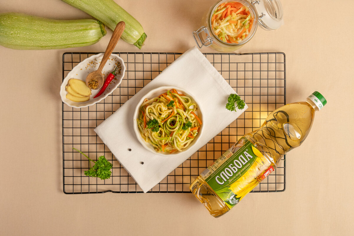 Натрите кабачки на корейской терке длинными полосками. С морковью проделайте тоже самое.